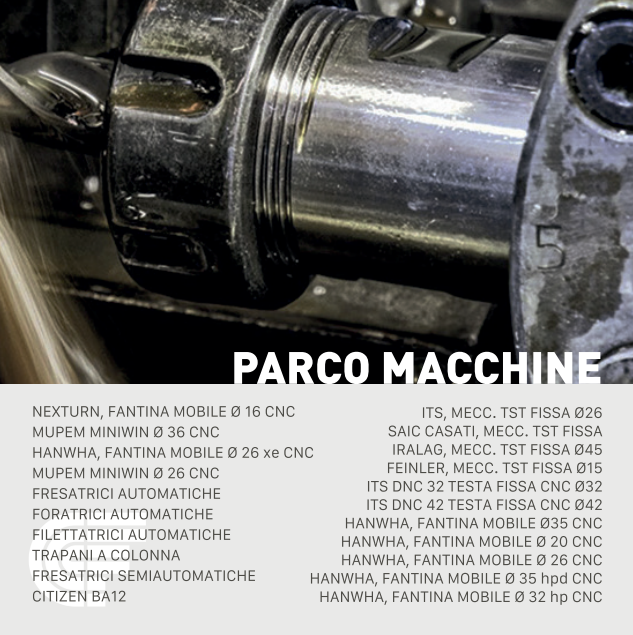 La nostra azienda si avvale di un parco macchine molto fornito, in continua evoluzione e tecnologicamente avanzato in grado di garantire ai Clienti precisione, qualità e velocità nei tempi di consegna. La vasta gamma di particolari viene prodotta a partire da metalli in barra, tutti di alta qualità e certificati a livello italiano ed europeo. Tutto questo ci permette di soddisfare le richieste dei nostri Clienti e di realizzare qualsiasi tipo di particolare tornito a disegno. Attualmente il nostro parco macchine è così costituito: