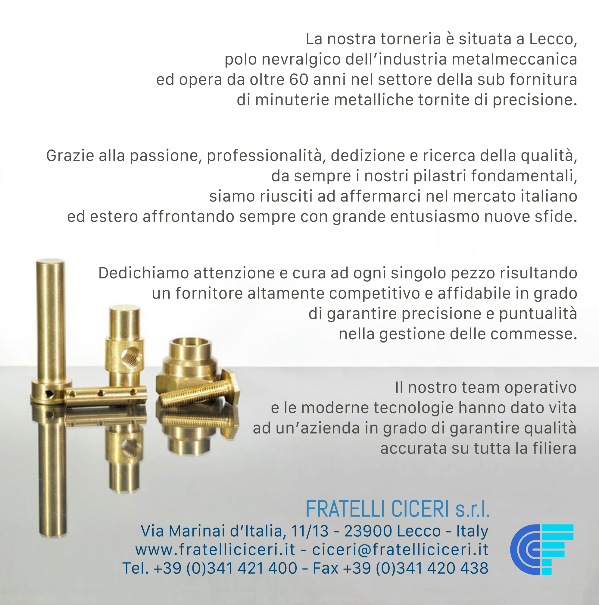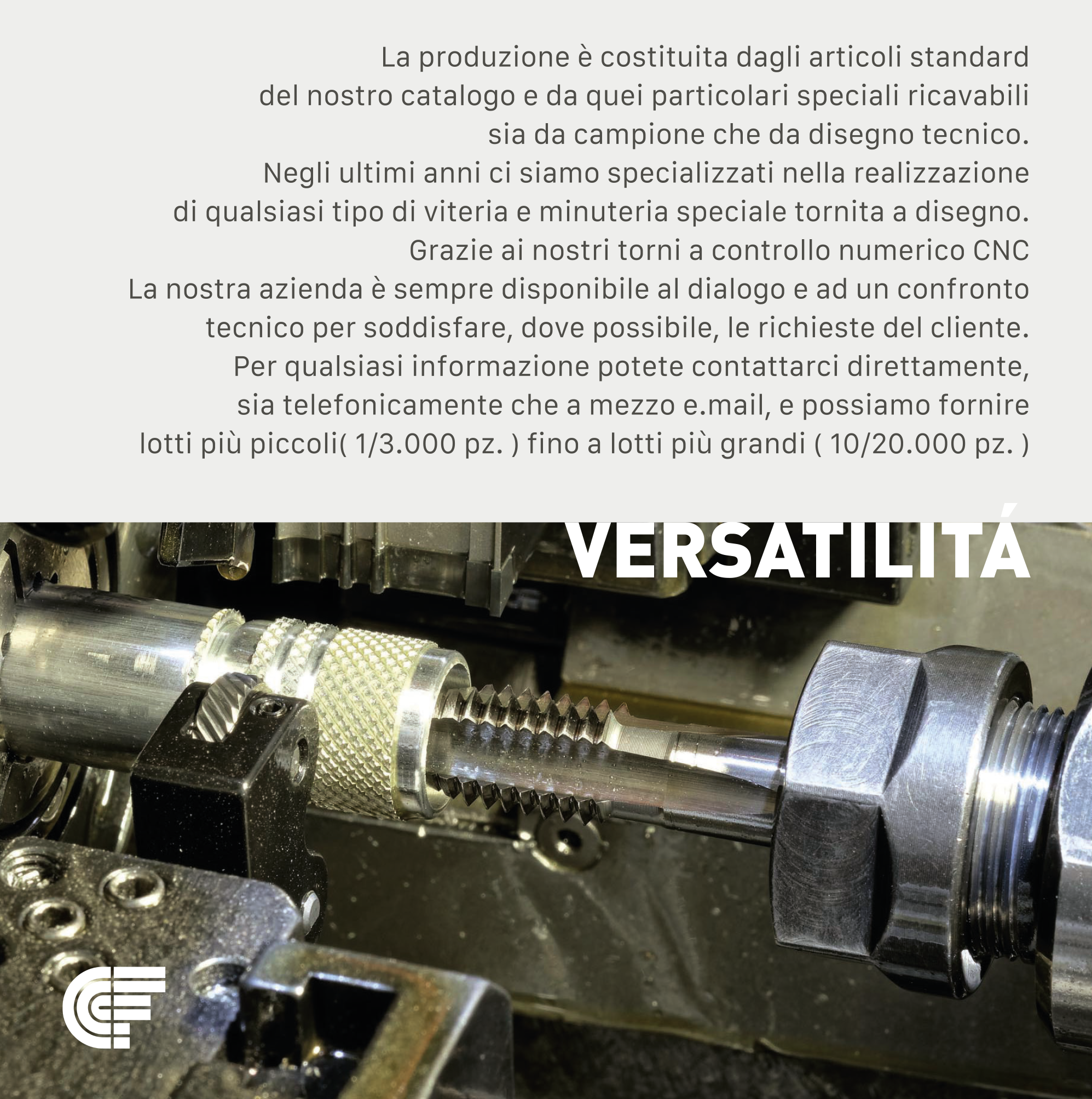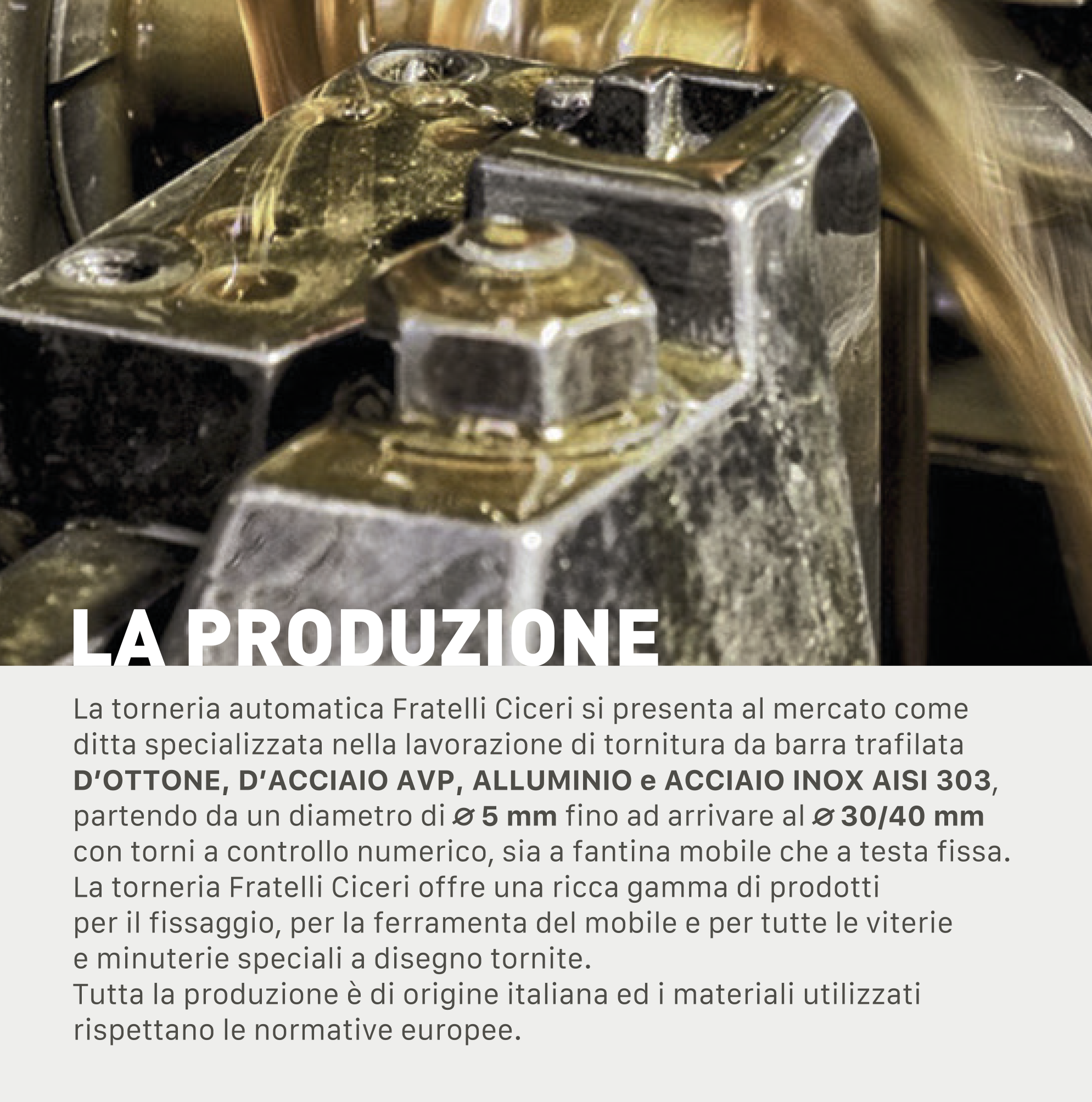 I particolari torniti di diverse tipologie e materiali , dal diametro 5 al diametro 30 mm, soddisfano aziende operanti in vari settori industriali. Tutta la produzione è di origine italiana ed i materiali utilizzati rispettano le normative europee garantendo un prodotto finale di massima precisione e qualità. Materiali trattati: Ottone (CW614/617N), Leghe di Alluminio (2011) Acciai (11SMnPb37(AVP) 36SMnPb14(PR80)) Acciai inossidabili (AISI303)